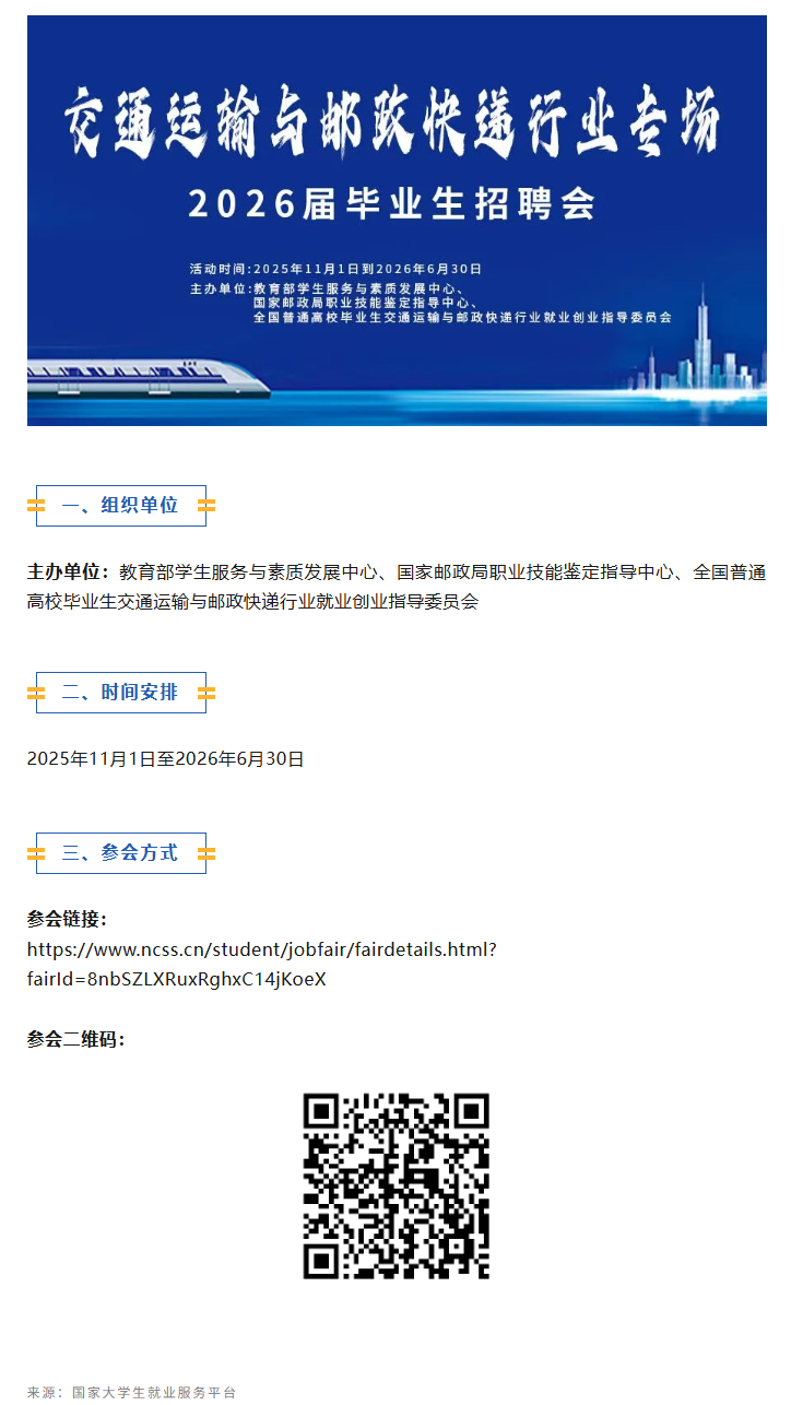 【就业直通车】24365招聘:交通运输与邮政快递行业专场2026届毕业生招聘会